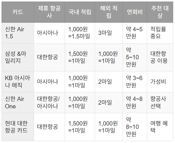 대표 항공 마일리지 신용카드 비교